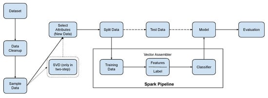 The primary research objective of this article is twofold. Firstly, the two-step feature selection and classification methodology is described. As a preprocessing step, the singular value decomposition () has been selected as it efficiently identifies eigenfeatures hidden in massive datasets. As stated in our previous work, learning new data features while preserving old data features can be considered as one of the most important goal of incremental learning methods []. Secondly, the results of the proposed methodology applied to a considerable number of real and synthetic datasets using the Apache Spark MLlib, a machine learning library optimized for distributed systems which provides among others the SVD functionality, are discussed. Several classification models such as decision trees, random forest, and logistic regression, have been investigated and their performance in terms of precision, recall and metric, as the dataset size varies, has been recorded. As a secondary objective, the specifics of the Spark system, along with the PySpark and the SparkQL modules developed in order to perform the two-step classification, are outlined.