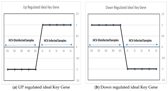 An ideal key gene can be defined as a gene that has a variation in its values in infected and disinfected samples [30]. In this work, two ideal key genes have been proposed, as shown in Figure 2. Upregulated key genes are used as a vector, with two different sets (−1, 1) of values in HCV-disinfected and infected samples. And a downregulated key gene is proposed as a gene with values of (1, −1) in the HCV-disinfected and -infected samples.