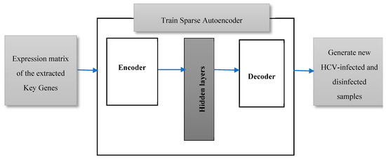 Mining the biological databases and literature, and examining the gene signal profiles for the top ranked extracted key genes have been extensively carried out in this work, as will be illustrated in the results section. However, the classification of HCV-infected and disinfected samples using the conventional classification algorithms has suffered from a deficiency in the number of samples. Twenty-four infected and disinfected samples are too insufficient to be split into training and testing samples. Most probably, the classification algorithms yield a worse predictive performance after being trained and tested on such a low number of samples. Therefore, in this work, we are proposing data augmentation of the expressions of the extracted key genes in the twenty-four samples to generate additional samples, as shown in Figure 3. A sparse autoencoder has been applied here, as it is one of the furthermost working methods for the field data augmentation [17]. It is a feed-forward deep neural network that generates an output, data X’, that is similar to an input data X using a set of low-dimension hidden layers [18]. A sparse autoencoder is an unsupervised neural network learning approach that tries to predict an output that is very close to its input. The input data are passed to an encoder which compresses and encodes the data. The encoded data, in turn, will be decompressed via a decoder. The weights of the closing hidden layer are the compressed picture of the input from which an approximated version of the original data can be regenerated. The number of nodes of both the input layer and the output layer are the same in case of data reconstruction.
