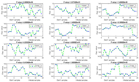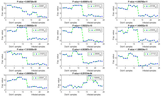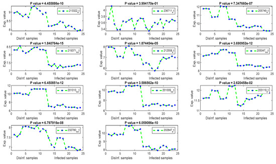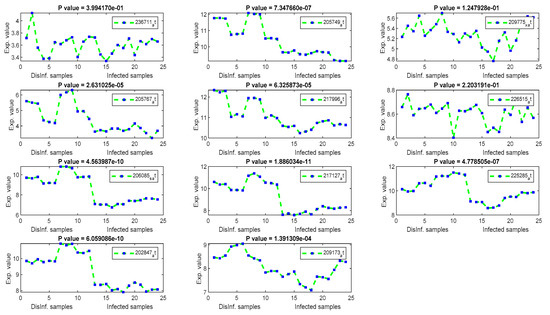 The gene signal profiles of top ranked key genes retrieved using each feature selection method are shown in Figure 4, Figure 5, Figure 6 and Figure 7. Each gene signal is plotted in HCV-infected and disinfected samples and its P-value is attached along with its Affy ID. The signal profile illustrates the up/downregulated genes. Each figure represents the plot of the gene expression value in the disinfected and infected samples. The x axis represents the samples, 12 samples for the disinfected samples and 12 for the infected one. The Y axis represents the gene expression value.