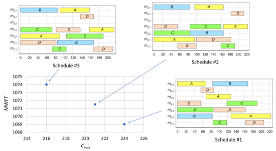 Figure 1, despite the relatively small differences in the values of the two objective functions, the three schedules exhibit large discrepancies in the processing sequences on machines and job routes. Of course, the small differences in the values of the objective functions will accumulate over the scheduling periods affecting the system’s performance on the long run.