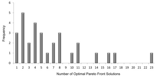 Another important characteristic is the wideness of the Pareto front which can be represented by the percentage difference between the maximum and the minimum values of both objective values for each instance. Dividing the wideness by the number of OPFs less than one provides an average indication of the spacing between solutions along the Pareto front for both objectives. This is referred to here as the spacing indicator. Therefore, for both objectives, the spacing indicators are evaluated as in Equations (