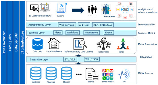Keralty organization currently have several information systems such as Health Information Systems (HIS), Lab Information Systems (LIS), Radiology Information Systems (RIS), Enterprise Resource Planning (ERP), and Customer Relationship Management (CRM), among others, in their ambulatory care centers, hospitals, and home care, which support their integrated health model. The information from these systems was not consolidated on a single platform, and its access and availability generated an operative load, which obstructs all health management processes and the support of clinical decisions for physicians. Consequently, we proposed the design and implementation of a healthcare, clinical, and business data repository with advanced analytic capabilities to consume machine learning prediction models to improve the decision-making process and population health management at the organization. The digital health platform conceptual framework is shown in Figure 1.