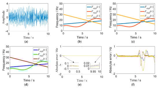 Frequency analysis of estimated component signal. (a) Original artificial signal. (b) Frequency of original component signal in time domain. (c) Frequency of estimated component signal extracted by RPRG. (d) Frequency of estimated component signal extracted by VSME. (e) Absolute error of estimated component signal frequency extracted by VSME. (f) Absolute error of estimated component signal frequency extracted by RPRG.
