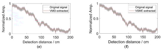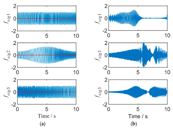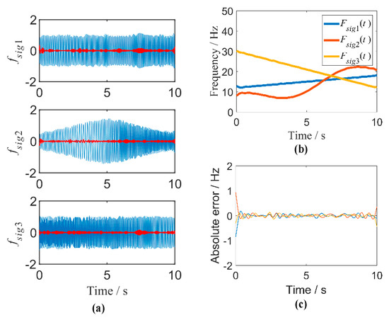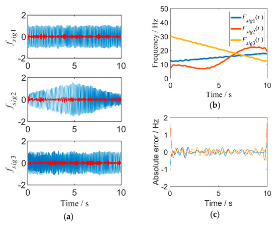 To compare with different methods, we employed VSME and VMD to extract the mode components of original signal . The red line shown in Figure 3a represents the estimated three mode components, and the blue line represents the absolute error between the estimated modes and the original modes in the vicinity of plane . The absolute error range is less than 0.05, and the relative error is not more than 1%. By comparing Figure 3a,b, we can conclude that the VMD algorithm has a poor separation result on mixed signals .