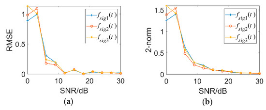 Error analysis under different SNR. (a) The values of RMSE; (b) the values of 2-Norm.
