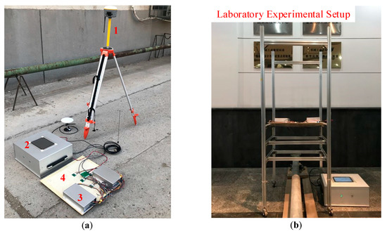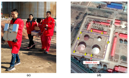 Laboratory experiment of pipeline inspection. (a) Picture of experimental setup, 1—Global positioning system, 2—Data Acquisition System, 3—Acquisition Card, 4—Magnetic Sensor; (b) Laboratory scheme design; (c) Field test; (d) Defect location.