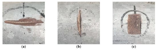 The shapes of these six defects are axial crack, transverse crack, square groove, through hole, blind hole, and 45-degree crack in turn, as shown in Figure 9. There were four different lift-off distance detection experiments, which are 0.5 m, 1.0 m, 1.5 m and 2.0 m, respectively.