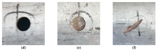 Images of defects in the ferromagnetic pipeline. (a) The size of axial crack is 30 mm × 1 mm × 1 mm; (b) The size of axial crack is 1 mm × 20 mm × 1 mm; (c) The size of axial crack is 12 mm × 20 mm × 1 mm; (d) The diameter of through hole is 10 mm; (e) The diameter and depth of blind hole are 10 mm and 1 mm; (f) The size of 45-degree crack is 1 mm × 20 mm × 1 mm.