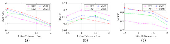 To further evaluate the detection effect of pipeline defects at different lift-off distances, the SNR, RMSE, and NCCC of defect signals were computed using these algorithms. Figure 11 plots the evaluation indicators for the six sets of data, which are obtained at different lift-off distances. SNR of extracted defect signal gradually decreases as the lift-off distance increases, as shown in Figure 11a. The performance of VSME is slightly higher than VMD and EWT, but significantly higher than BPF. RMSE of the VSME-processed signal is generally lower than the other three methods, indicating that the proposed algorithm is more reliable, as shown in Figure 11b. When the lift-off distance increased from 0.5 m to 2 m, the value of RMSE showed a trend of increasing first and then decreasing. Through experimental analysis, when the lift-off distance is 1 m–1.5 m, the excessive RMSE fluctuation is due to the joint effect of the pipeline magnetic field signal and the surrounding interference, which leads to the instability of the magnetic field. As the lift-off height increases, the pipeline magnetic field signal weakens, thus the value of RMSE decreases. Figure 11c shows the NCCC, the performance of BPF is the worst, and VSME is slightly better than the other two methods. The analysis of the mentioned three filtering indicators shows that the VSME algorithm has good performance in the extraction of pipeline defect signals.