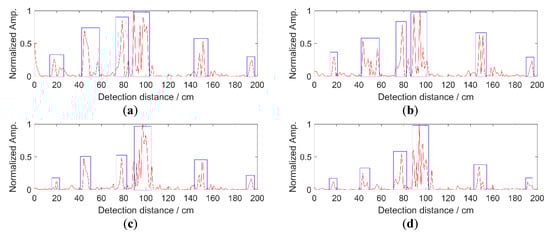 Defect detection results of pipeline at different lift-off distances in laboratory. (a) Lift-off distance is 0.5 m; (b) Lift-off distance is 1.0 m; (c) Lift-off distance is 1.5 m; (d) Lift-off distance is 2.0 m. Six blue boxes from left to right are the defect locations on pipeline, which are axial crack, transverse crack, square groove, through hole, blind hole, and 45-degree crack in turn.