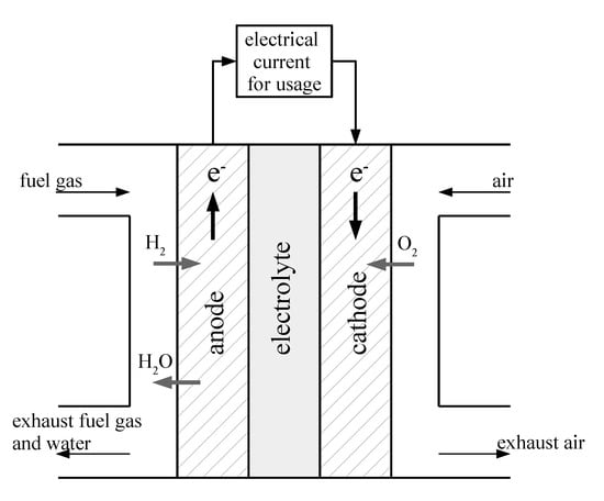 As shown in Figure 1, the supplied hydrogen gas reacts with oxygen ions at the anode. Free electrons flow through an external circuit, which is implemented at the available test rig as a variable Ohmic resistor. In such a way, the fuel cell, respectively, the series concatenation of multiple cells in a corresponding stack module, serves as a directed current source for the consumer. Finally, the produced flow of electrons reaches the cathode to react with oxygen that is supplied in terms of preheated ambient air.