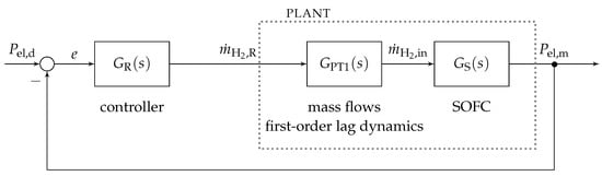 Since we do not know the actual power need commanded by the SOFC user, the controller should follow a smooth trajectory comprising phases of both increasing and decreasing electric power with good tracking accuracy. For this, four controllers, three linear and one nonlinear, were developed and compared with each other. Assuming that a potential consumer specifies the desired power , the reference variable is given and the difference to the measured power can be made use of, as shown in Figure 3. The controller determines the hydrogen gas mass flow as the manipulated input variable into the plant.