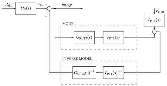 In addition to the transfer function in Equation (2), the hydrogen gas mass flow , representing the stack inlet from the previous section, has a significantly delayed reaction to the commanded signal of the manipulated input variable. This is considered in the additional transfer function