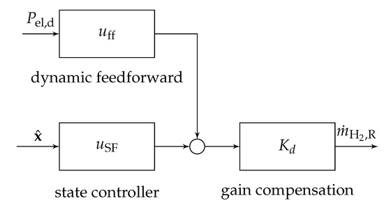 Usually, the integral term in the PI controller already leads to robustness against static gain errors [17]. However, it needs to be chosen in such a way that a compromise is found between damping and fast transient responses, because of the influence of the parameter on the overall phase reserve. Basically, it is set equal to the largest plant time constant of Equation (2). For the simplified dynamic feedforward control design, the SOFC system is approximated by