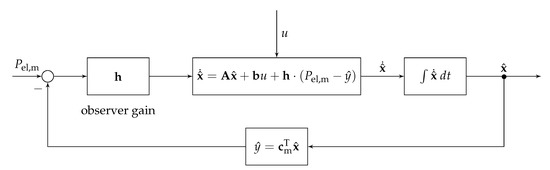 For the sliding-mode controller as well as for the linear state-feedback controller, time derivatives of the measured electrical power, in Equation (12), are needed additionally. Unfortunately, they cannot be measured, so they are reconstructed by a Luenberger observer, shown in Figure 8. This observer was developed with the help of the approximate system in Equations (27) and (28).