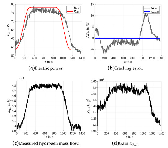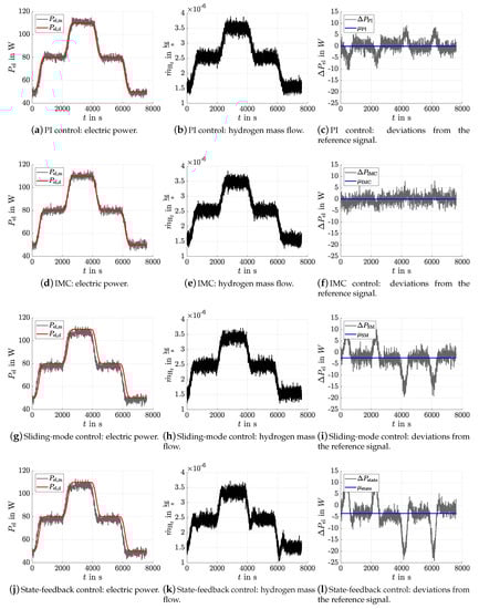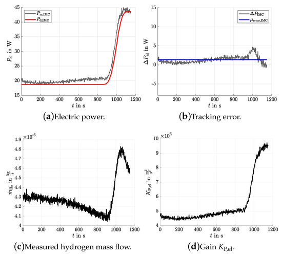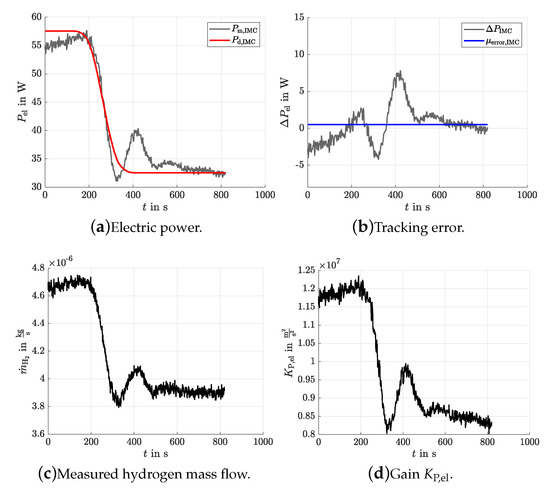 The PI controller and the IMC were implemented and validated in some experiments at the available test rig. An activation of the sliding-mode control and the state-feedback control in the experiment confirms the unacceptably large control amplitudes, leading to actuator saturations, which make the employed linear plant models invalid. For the experiments, the desired trajectory was slightly adjusted compared to the simulation. There, the challenge was to find a trajectory which remains in the validity domain of the model. The hydrogen mass flow has a lower limitation, which marks the minimum mass flow necessary to guarantee the desired current, here . By undershooting this limitation, the load would consume the whole hydrogen inside the fuel cell due to excessive fuel utilization, where the approximated model obviously turns invalid as soon as the current and electric power break down. The designed desired trajectory has to prevent such kind of invalidity.