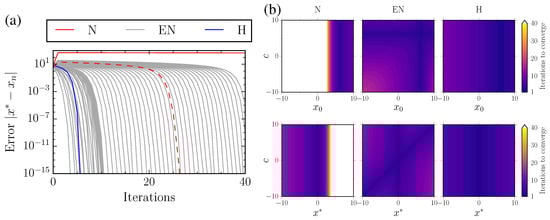 (a) Convergence of the standard Newton’s method (red lines), the Extended Newton method with (gray lines), and the Halley’s method (blue line) for solving (solid curves with initial guess and dashed curve with initial guess ). (b) (From left) Iterations taken to converge for the standard Newton’s method, the Extended Newton method, and the Halley’s method for solving : with and varying initial guess (top), and with and varying (bottom)