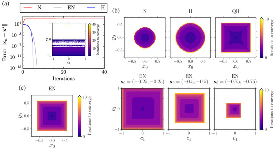 The solution of (20) lies at , and the basin of attraction is relatively small using the standard Newton’s method. Our proposed methods increase that basin significantly (Figure 2b). Surprisingly, the improvement using quasi-Halley’s method is even greater than the Halley’s method. Furthermore, Figure 2c demonstrates that choosing c as a perturbation to the initial guess also provides a significant improvement over the classical Newton’s method.