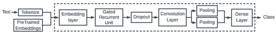 Hochreiter and Schmidhuber [57] proposed Long Short-Term Memory networks to counter that decay. The novel unit of the LSTM architecture is the memory cell that forgets or remembers the information passed from the previous chain link. The Gated Recurrent Unit of Model 2 was introduced by Cho et al. [58]. Its architecture is similar to LSTM units, but with the absence of an output gate. It is shown that GRU networks perform well on Natural Language Processing tasks [59].