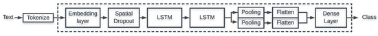 The dense layer is comprised by fully connected neurons both forward and backward. Every element of the input is connected with every neuron of this layer. In four out of five models, a dense layer can be seen at the end of the pipeline. The number of neurons in these layers is the number of classes in our dataset. For the third model, where TF-IDF tokenization takes place, we chose a simple DNN with 3 fully connected layer, which decreasing number of neurons for each subsequent layer. DNNs with multiple dense fully connected layers is shown to perform better than shallow DNNs [60].