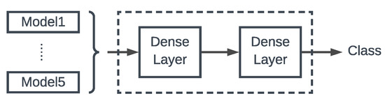 The main idea behind stacked ensembles is to combine a set of trained models through training of another model (meta-model). The output predictions of the meta-model are based on the training of the model outputs, Algorithm 1. In our implementation we fit the models output into a DNN with two hidden dense layers, Figure 6.