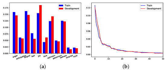 The Development dataset consists of 886 Tweets with the 11 aforementioned classes and their respective labels. The class distribution in Train dataset is skewed in favor of five emotions, anger, disgust, joy, optimism, and sadness. The same class distribution is evident in the Development dataset, which is dominated by the same five emotions, Figure 8a.