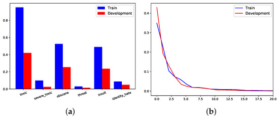 The Development dataset consists of 63,978 toxic comments with the same classes and their respective labels. The class distribution is heavily skewed towards toxic, obscene and insult, in both Train and Development, Figure 9a.