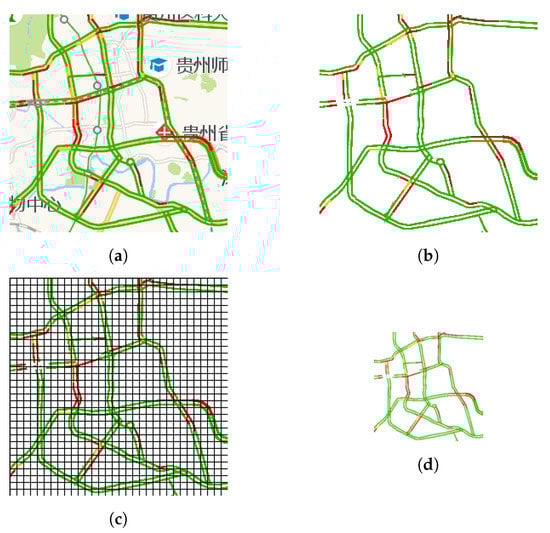 Congestion maps of an urban area traffic network in Guiyang, Guizhou, China. (a) A raw snapshot of the traffic network’s congestion map. (b) Only the road network marked with congestion levels is retrained after removing the background and other elements. (c) An original congestion matrix visualized as a network-only image is partitioned into grids. (d) A down-sampled traffic congestion matrix rendered as a map.