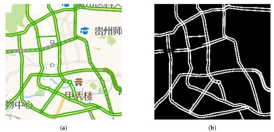 Originating from various traffic detectors [45] or powered by online map services such as Google Maps [46], real-time traffic condition maps of transportation networks are regularly archived in the form of snapshots by transportation administration departments 24 h a day, 7 days a week, and are provided online [47,48]. In order to build a dataset of traffic congestion data, we first create an initial data source in this work by complying with procedures used by these transportation administration departments. Figure 1a is an example of a raw snapshot of a traffic congestion map for an urban area in Guiyang, Guizhou province, China, which was one of top 10 most congested major cities in China in 2019 [49]. Each raw snapshot for this area is 256 pixels wide and 256 pixels high and mainly covers urban arterial roads. Such snapshots are retrieved at a scale of 1:50,000 every 10 min during morning rush hours between 07:00 and 10:00 from 1 January 2019 to 30 September 2019 through a free API provided by an online map service provider AutoNavi [50]. Requests to that API sometimes fail and cause missing data, which are left blank as is in this paper. These snapshots form an initial data source of traffic congestion data.