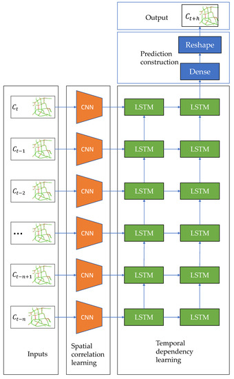Convolutional neural networks (CNNs) use convolution filters to extract local and global features through sliding windows, and can learn spatial correlations of traffic flow variables nearby or in entire cities [22,27,35,36,37]. Long short-term memory neural networks (LSTM) were proposed by Hochreiter and Schmidhuber in 1997 [38]. They can learn temporal relationships and dependencies from time series data and have been applied to short-term traffic prediction [5,39,40,41]. Deep learning models combining CNNs and LSTMs are widely used in the literature regarding traffic flow prediction and can capture both the spatial correlations and temporal dependencies of traffic flow variables on road networks [5,36,42,43,44].