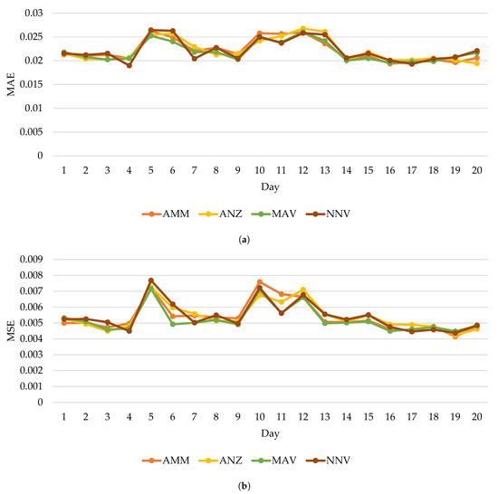 As an example of the prediction errors by day, details about the daily prediction performance in terms of MAE and MSE with a horizon of 40 min are shown in Figure 5. It can be seen that MAV has a smaller variation than ANZ, AMM, and NNV, which is confirmed by the standard deviation values shown in Table 3.