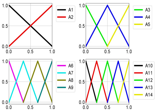 Fuzzy classifiers usually rely on a single granulation of the fuzzy variables, however this approach is not always efficient. One of the ways of improving the accuracy, proposed in [22], is to use several fuzzy granulation levels, for example into 2–5 fixed triangular terms. This allows keeping the interpretability while improving the accuracy. The used granulation is presented in Figure 1. The algorithm also used the “Don’t Care” condition to simplify the rules.