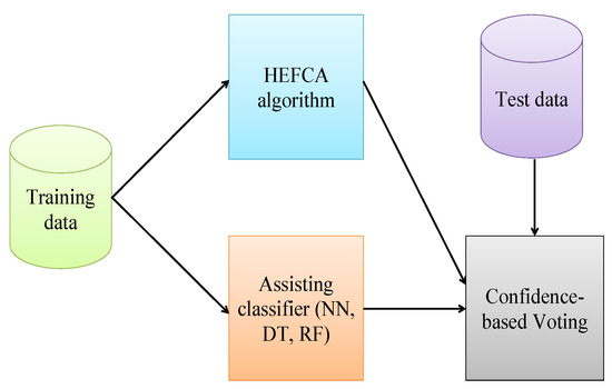 The Confidence-Based Voting procedure realizes relatively simple idea of combining two classifiers: if one of the classifiers is not sure in its final decision, then the other classifier may help make the right decision. The experiments on several datasets have shown that this idea works relatively good in many scenarios for classifiers which have some kind of confidence measure. For example, the HEFCA algorithm used in this study has clear measure of confidence, i.e., the membership value returned by the winner rule, however other classifiers, like neural network with softmax layer, could be used as well. For other classifiers, these confidence measures could be constructed, for example, for the k-NN classifier this could be the fraction of neighbors belonging to the right class, or the relative size of the final leaf in case of decision tree, or the ratio of the number of trees voting for the same class in random forest. So, the CBV is a relatively simple and efficient technique, which could be expanded also for more than 2 classifiers.