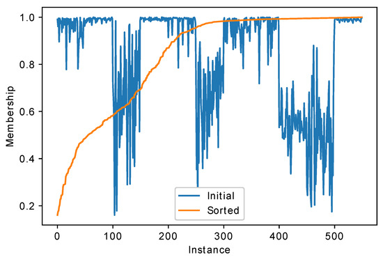 From Figure 5 it could be seen that for around 80% of the test sample the confidence of the HEFCA algorithm is larger than 0.75, for other instances the membership values drop. The accuracy for this dataset is around 0.87, and 85% of the test set has confidence larger than 0.5. For the neural network, the confidence changes differently, i.e., only a small part of the dataset is classified with high confidence.