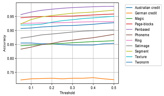 The threshold values were changed from 0.05 to 0.5 with 0.05 step. As could be seen from Figure 7, for most datasets where the random forest had better results than HEFCA, the accuracy grows with larger threshold, i.e., with larger percentage of the test sample classified by random forest. However, for some datasets, for example, twonorm or german credit, there is almost no accuracy increase, probably due to the fact that the fuzzy classifier and random forest make errors on the same instances.