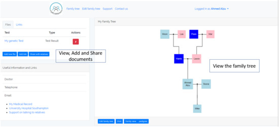 To understand the processes that take place, we have developed an application, myKinMatters, that allows us to explore how users can specify permissions and consent. myKinMatters, shown in Figure 1 offers patients a secure way of sharing their genetic test results electronically with their relatives and has a variety of functions i.e., supports the patient with creating a family tree; allows the patient to take their family tree to their clinician who can mark on the app which relatives could benefit from being given the information; allows the patient to upload their genetic test result document along with any other documents they wish to share; send documents electronically to relative’s email or mobile phone; and track which relatives have opened the documents. We co-designed myKinMatters with clinicians and health professionals at a University Hospital Trust, and have deployed the application with test users in simulated scenarios as part of intervention trials.