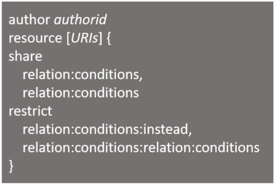 Figure 3 shows a high-level grammar for a single policy defined in our policy language which operates over the resources and owners described above. Parts below that are written in bold are the language keyword. When defining the policy we need to state who is the owner of this policy, which is achieved by stating the policy owner or author in the place of authorId. A policy is not limited to a single resource, but can be attached to a set of resources. The resources to associate with a given policy should go within [URIs], where resources would be separated by delimiter “,”.
