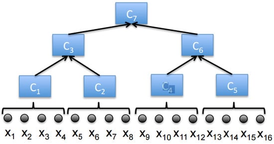 Coresets construction from data streams []. The black arrows indicate “merge-and-reduce” operations. The intermediate coresets are numbered in the order in which they would be generated in the streaming case. In the parallel case, and would be constructed in parallel, followed by and , finally resulting in . The Figure is from [].