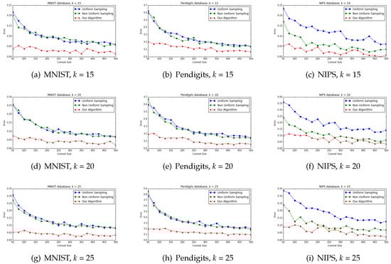 We applied our coreset construction to boost the performance of Lloyd’s k-means heuristic as explained in Section 8 of previous work []. We compared the results with the current data summarization algorithms that can handle sparse data: uniform and importance sampling.