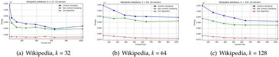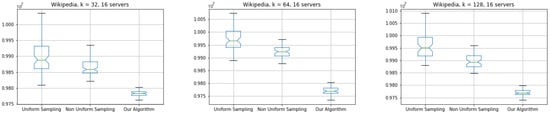 Comparison of uniform sampling, non uniform sampling and our algorithm based on Wikipedia in distributed setting with 16 servers.
