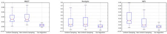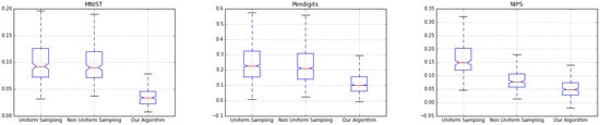 Figure 5, Figure 6 and Figure 7 show the box-plot of error distribution for all the three coresets in the offline and streaming settings. Our algorithm shows a little variance across all experiments, its mean error is very close to its median error, indicating that it produces stable results.