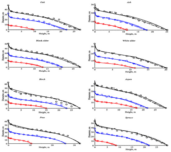 This study examines the performance of 11 tree taper models to predict the diameter of bark at any given height and the total stem volume of eight dominant tree species in the boreal forests of Lithuania. Here, we develop eight new models using stochastic differential equations (SDEs). The symmetrical Vasicek model and asymmetrical Gompertz model are used to describe tree taper evolution, as well as geometric-type diffusion processes. These models are compared with those traditionally used for four tree taper models by using performance statistics and residual analysis. The observed dataset consists of longitudinal measurements of 3703 trees, representing the eight dominant tree species in Lithuania (pine, spruce, oak, ash, birch, black alder, white alder, and aspen). Overall, the best goodness of fit statistics of diameter predictions produced the SDE taper models. All results have been implemented in the Maple computer algebra system using the “Statistics” and “VectorCalculus” packages.