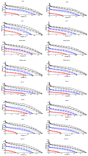 The mathematical link between tree diameters at any specified height where the height is known is known as a tree (stem) taper equation. The random variables of interest in the present study are the diameter at any specified height and the relative diameter at any specified relative height. Stem taper equations are traditionally used to estimate diameters at any specified tree height, conversely, to estimate a corresponding height at any specified diameter, and to estimate the total tree volume or the volume of specified products if given the specified dimensions. Stem taper equations are the ultimate base of computer algorithms for calculating stem volumes of any assortment of structures. In the forest literature, many papers have already looked into the link between the relative diameter and relative height of trees. However, the most published models are deterministic regression models. It is advisable to divide taper equations into five categories, namely, (1) segmented polynomial taper equations [14], (2) variable exponential equations [15,16,17], (3) artificial neural network (ANN) equations [18], (4) fundamental mechanisms of stem profile formation equations [19,20], and (5) diffusion process equations [21]. The first four categories include deterministic taper models that describe the variation of the stem form by means of a single equation, where the diameter at any specified stem height is the dependent variable, while the diameter at breast height and overall height are the independent variables. Some researchers demonstrated that including a variable of crown size, stand density, age, and others as a predictor could help explain variation in tree shape [22].