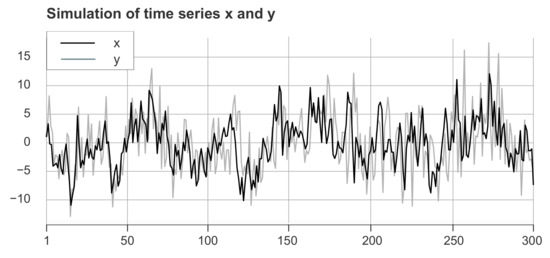 Simulation of time series x and y with regimes and lead–lag relations , , and . Therefore, y follows x by 1 lag in the first phase, 3 lags in the second phase, and 5 lags in the third phase.