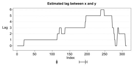 Figure 5 depicts the detailed development of our estimated lags, i.e., the difference between the index of x and the index of y. We note that the length of the optimal causal path is greater than (see Section 2). The first regime possesses a length of around 110 and shows a constant course of 1, i.e., x leads y by 1 lag. The first structural break initiates the second sub-period, which exhibits a lag of 3 and is terminated with the second regime-switch. The third phase shows a time delay of 5 with a short-term outlier to lag 6. Since we have two time series with identical time period, the concept of causal paths, like any approach in this field of research, requires a burn-in period and a burn-out period.