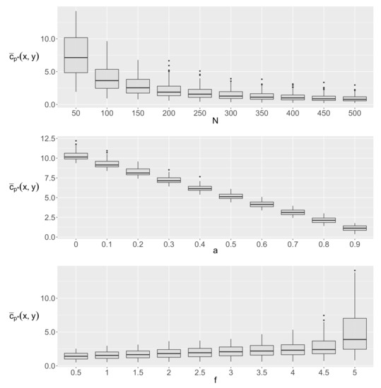 According to [9], this manuscript evaluates the performance of the generalized causality algorithm based on a two-stage procedure. First, the time series X and Y are generated whereby we vary ceteris paribus the sample size N, the coefficient a, and the noise level f—the other parameters remain the same because they do not directly influence the dependency between the two time series. Second, we apply our algorithm to identify the optimal causal path and to calculate the corresponding total cost. Following [63,64,65], we conduct 1000 repetitions for each parameter constellation. Figure 6 shows the resulting boxplots of the average total costs for varying the parameters N, a, and f.