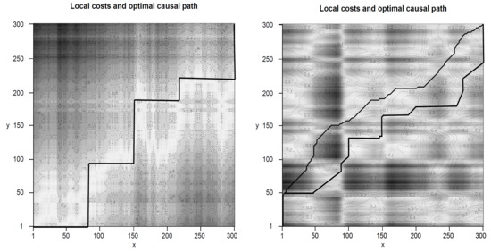 We define the total cost of as , which is the sum of all local costs of (see Equation (3)). Figure 1 illustrates the local costs and the optimal causal path of two given time series x and y. The points of runs along a “valley” of low cost (light colors) and avoids “mountains” of high cost (dark color).