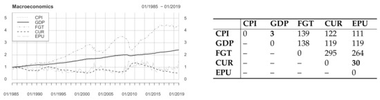 The first data field we want to draw attention to is macroeconomics. The time series consumer price index (CPI), gross domestic product (GDP), federal government tax receipts (FGT), civilian unemployment rate (CUR), and economic policy uncertainty (EPU) cover the time period from January 1, 1985 to January 1, 2019 at monthly frequency, which means 137 entries per time series. The reason why our examined period of time starts in 1985 is that EPU was set up starting at that time only. The left-hand side of Figure 8 shows the development of the normalized data over the examined time period. We see that GDP and CPI follow an almost linear trend, whereas the other time series, such as FGT underlie more fluctuation. Furthermore there is a co-movement of CUR and EPU, with some peaks of EPU being followed by a similar development of CUR. The right-hand part of Figure 8 gives an overview of the distances between all time series after having applied the generalized causality algorithm. The two pairs with minimal total distance are (i) GDP and CPI as well as (ii) CUR and EPU. It is not surprising that GDP and CPI have small total distance. Their development over time is similar, as can be seen in Figure 8, and the variables mutually depend on one another. The small distance between CUR and EPU is an interesting finding, as unemployment usually is accompanied with uncertainty. Figure 9 and Figure 10 help to learn more about the causal relationship of these pairs. Please note that in this subsection as well as in Section 4.3 and Section 4.4, we will only consider figures of type Figure 4, because they contain more information than graphics such as Figure 5.