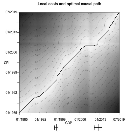 Figure 9 shows that gross domestic product (GDP) and consumer price index (CPI) most of the time move almost perfectly together, with the lead switching regularly. However, the lag is never more than a few months. There are two structural breaks in the lead–lag structure approximately at the end of 1997 (from CPI to GDP as the leader) and around the second third of 2010 (back to CPI as the leader). Incidences that might have had an impact on this relationship are the Asian financial crisis in 1997–1998, which influenced other economies of the world as well [71,72] and the European financial crisis that was still prevalent in 2010 [73]. Taking a closer look at Figure 9, we see that there is an area of very low cost, i.e., a region of almost white color, approximately along the diagonal. This is not surprising if we look at the development of GDP and CPI over time as shown in the left part of Figure 8. The two time series move almost perfectly together, which means low cost along the diagonal. The similarity of the series is due to their (partial) mutual dependency. Since CPI is a measure of inflation and GDP naturally increases with higher prices (caused at least partly by inflation), rising prices imply larger values of both.